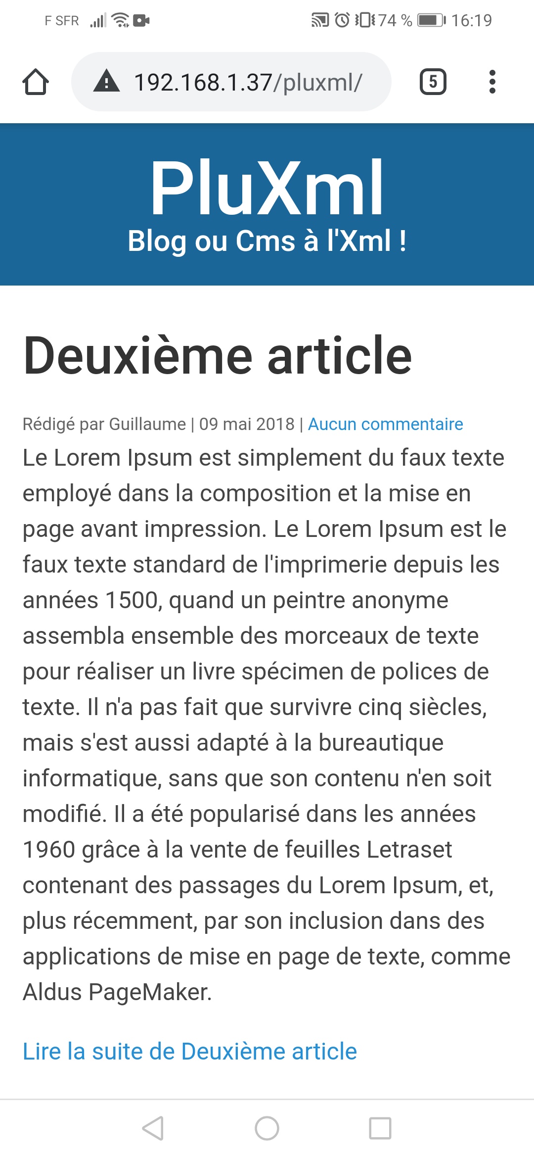 Page web local visible sur un téléphone.