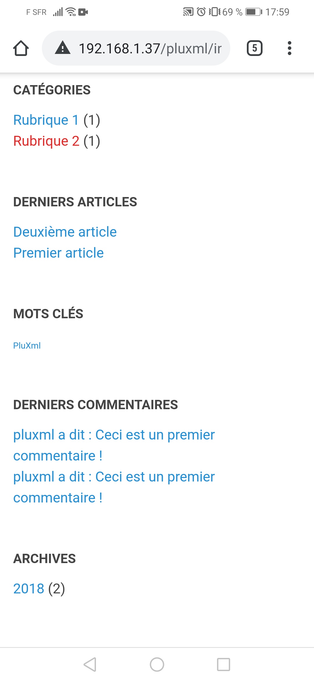 Page web local visible sur un téléphone.